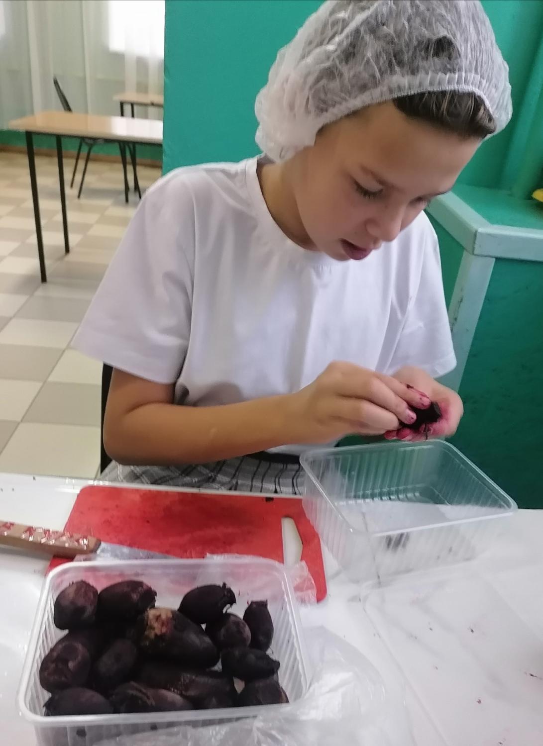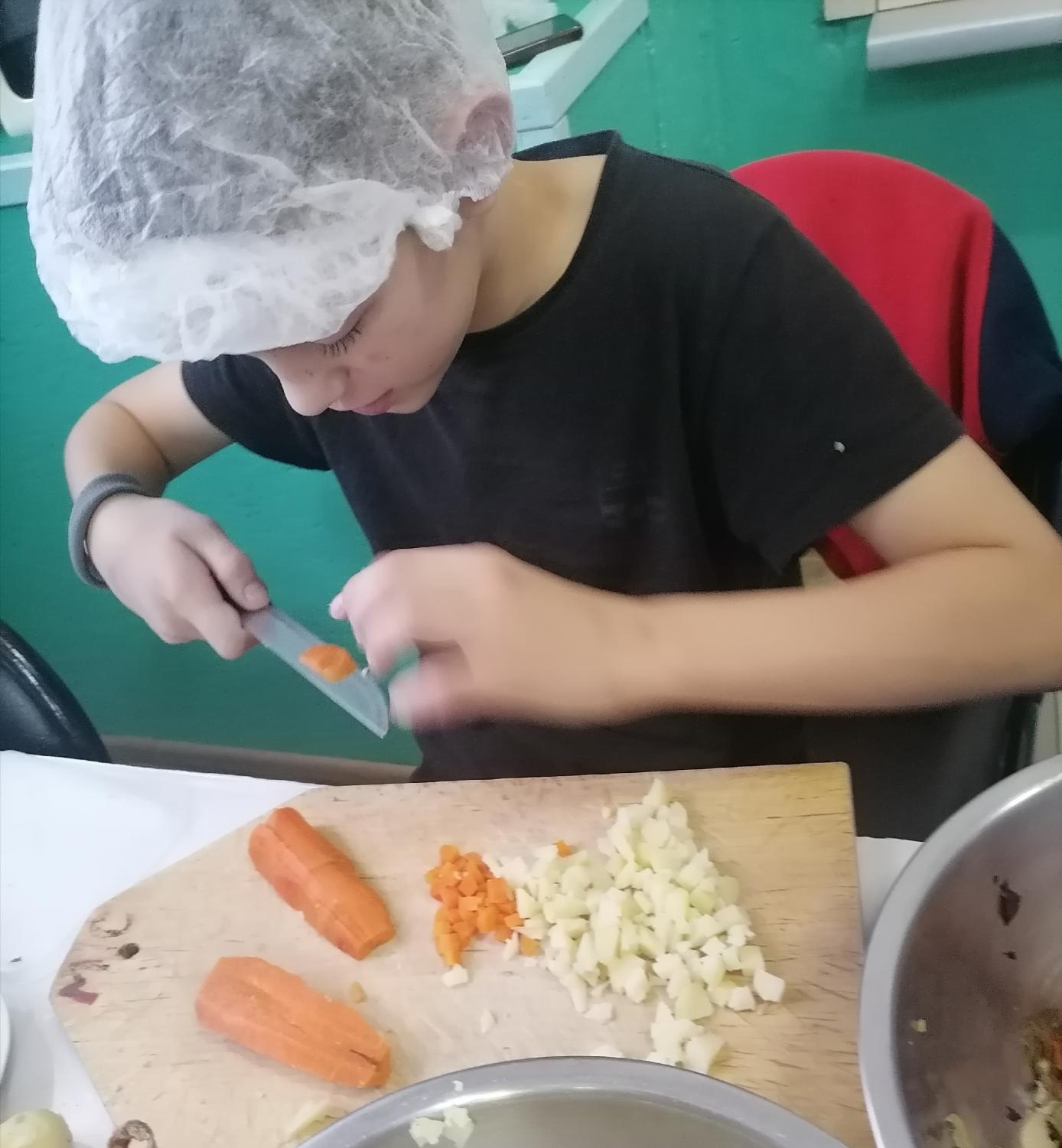 Овощи заранее отварили и почистили. Для детей постарше подготовили разделочную доску, нож, фартук , головной убор.